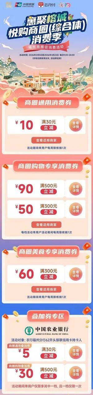 记者获悉,2月5日起,福州启动“惠聚榕城 悦购商圈(综合体)消费季”活动,市民可通过云闪付等平台领取,在全市重点商超、餐饮门店、大众茶馆等场所直接抵扣。
